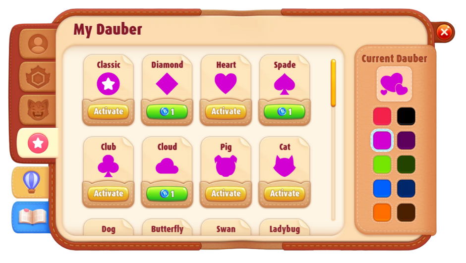 This tab lets you customize your Dauber just to your preference – choose between all the fun shapes and pick the perfect color to go with it!