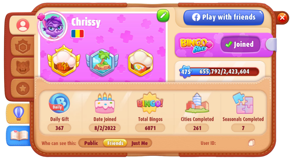 – Here you can check the info about your Bingo Blitz account – from Daily Credits, Total Bingos, Cities and Seasonal Rooms completed, to setting who can see your profile and checking your User ID.
